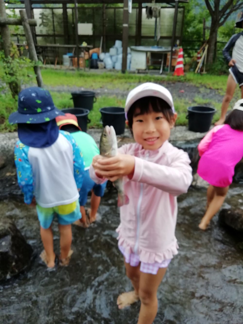 くじら組(5歳児)がヤマメのつかみ捕り体験をしました。池の中で泳ぐヤマメを一匹ずつ捕まえましたよ。素早く泳ぐヤマメを上手に捕まえたり、友だちと協力して捕る姿もありましたよ。 |