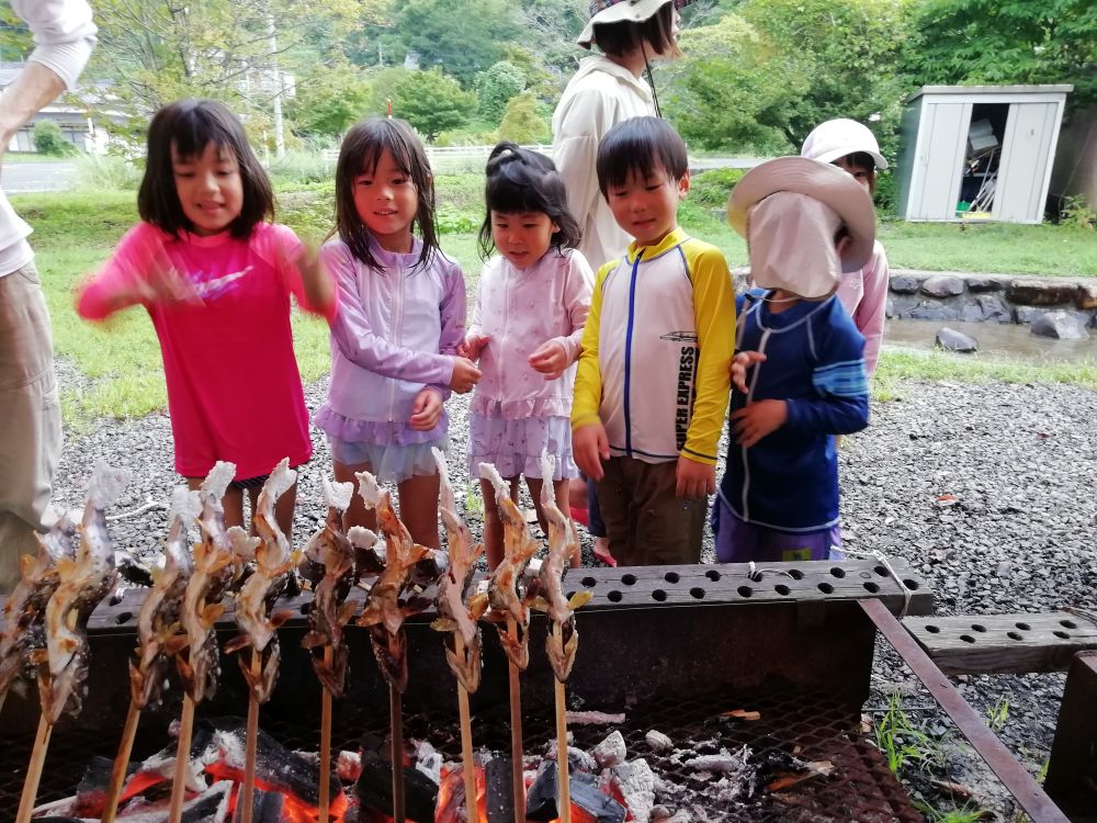 つかみ捕りをしたヤマメをその場で焼いてもらって食べました。焼き立てで、自分たち捕ったヤマメはとっても美味しかったですよ。 |