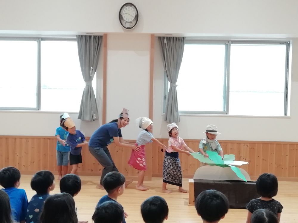誕生会でくじら組が「大きなかぶ」の劇をしました。自分たちで配役を決めたりお面作りもしました。他のクラスの子どもたちも楽しんで観ていましたよ。 |