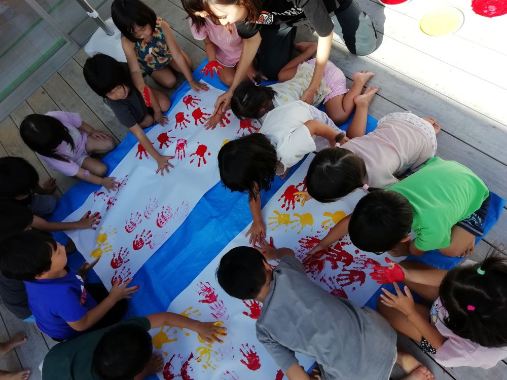 しろくま組(4歳児)が、絵の具で手形をしました。紙一面が子どもたちのかわいい手でいっぱいになりました。この紙を運動会の入場門に使いますよ。 |