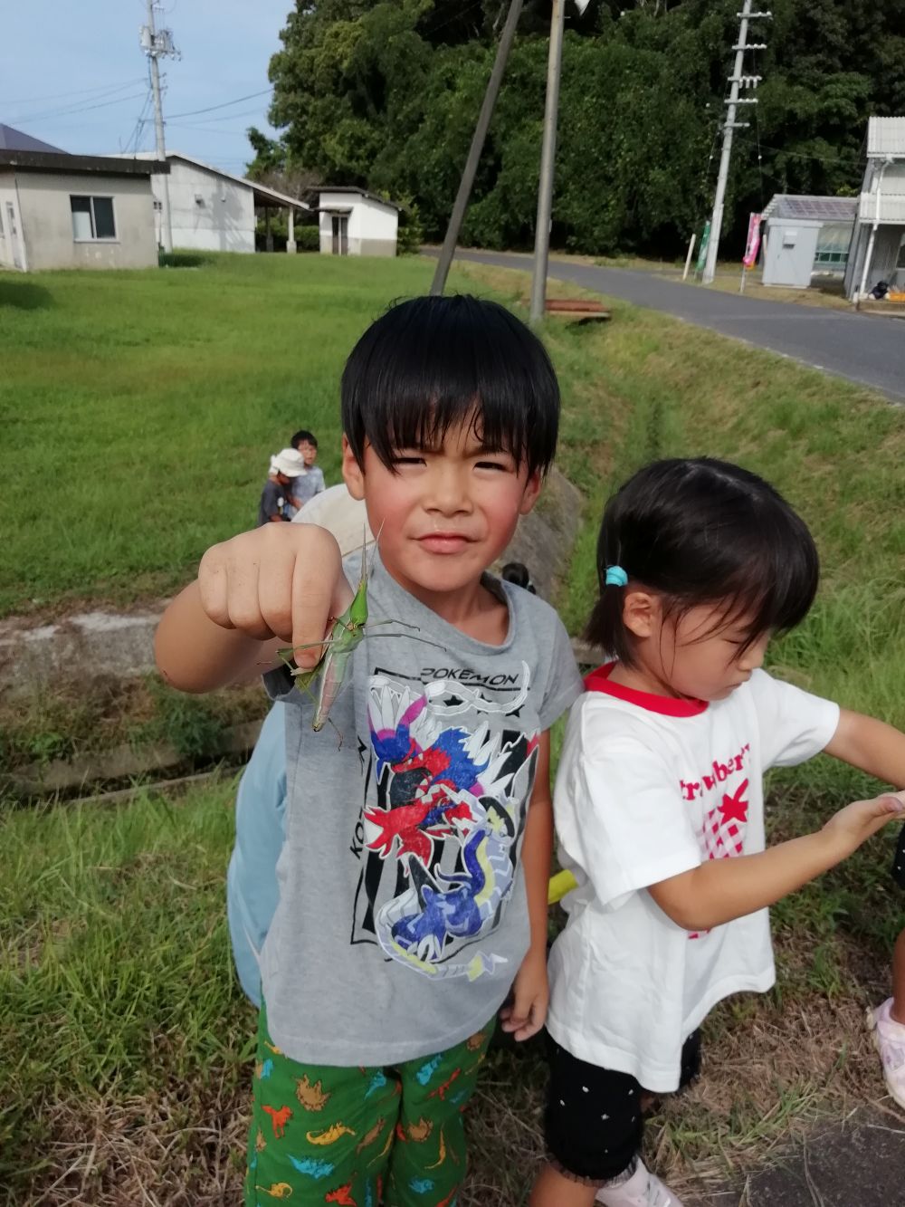 しろくま組が散歩先の草原でバッタを見つけ、夢中で追いかけていた子どもたちでした。捕まえることができ、とっても嬉しそうでしたよ。 |
