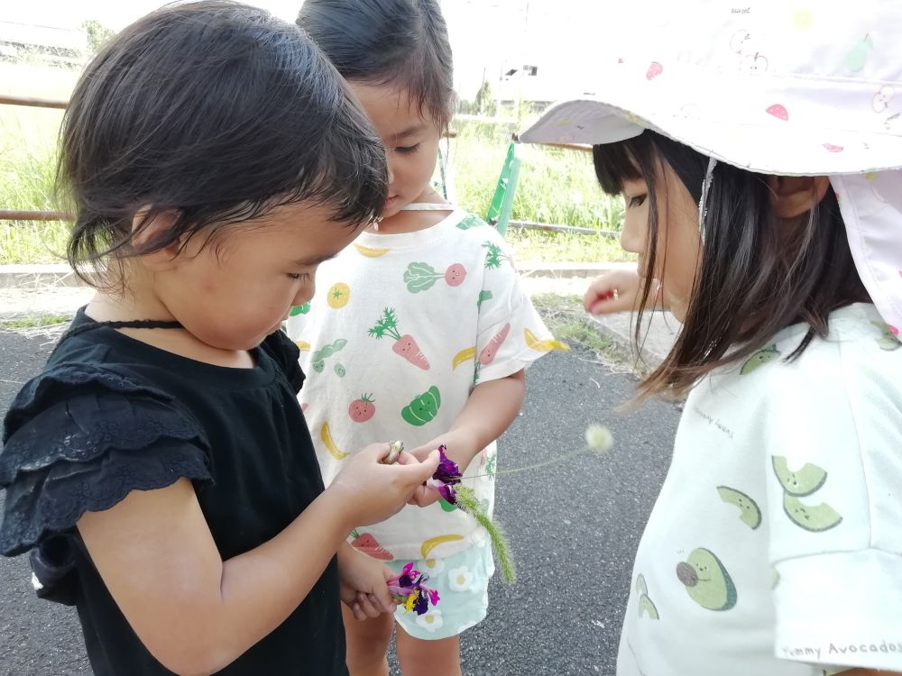 あしか組(3歳児)が散歩に出かけました。草花を摘んでは友だちと見せ合ったり、「おみやげにする!」と大事に園まで持ち帰っていましたよ。 |