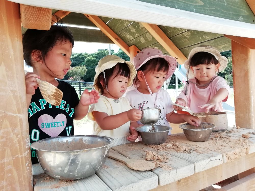 友だちと一緒がうれしくて、友だちと一緒にログハウスの中でままごと遊びを楽しんでいる、いるか組(2歳児)の子どもたちです。 |