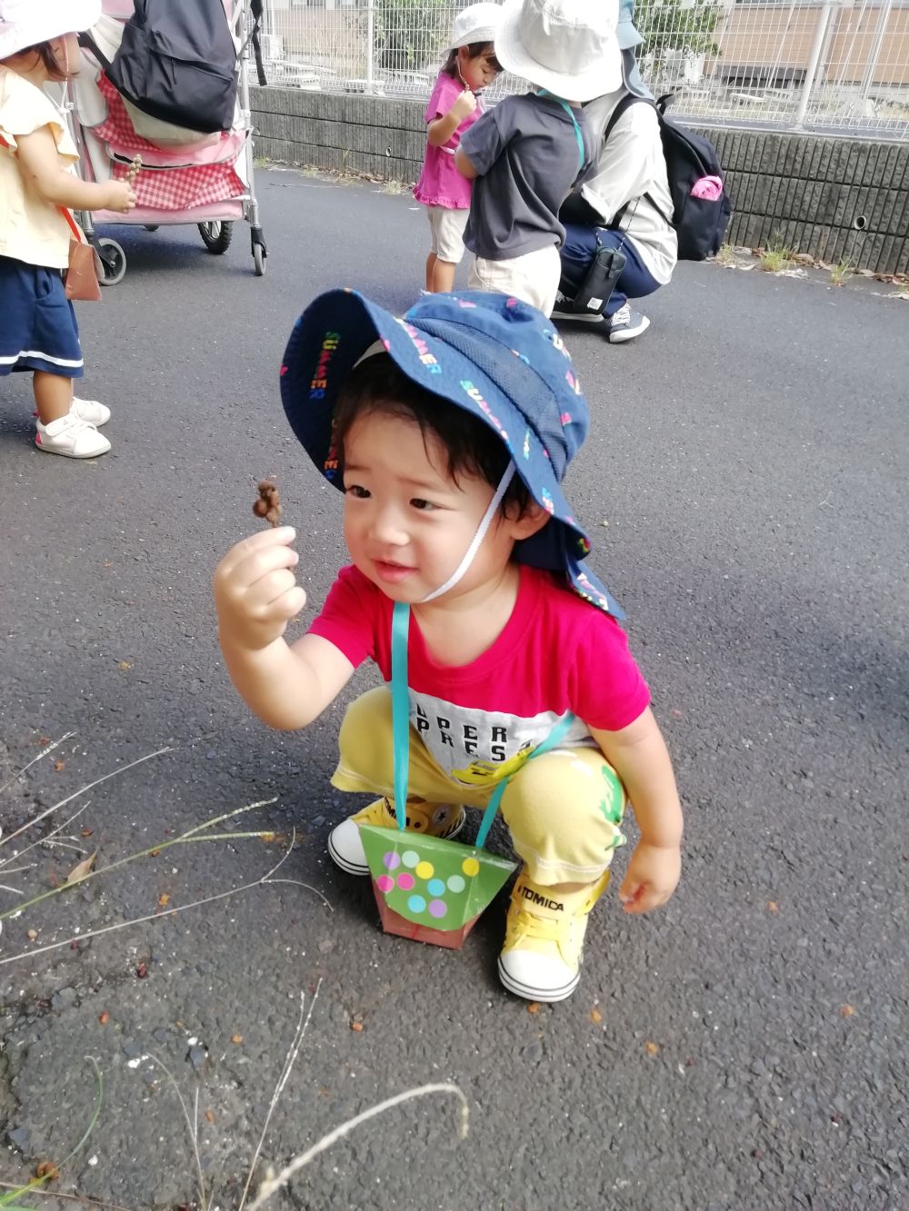 らっこ組(1歳児)がどんぐり並木まで散歩に出かけました。拾ったどんぐりをお散歩カバンに入れてうれしそうでしたよ。 |