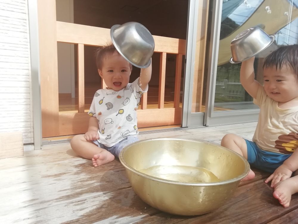 ぺんぎん組(0歳児)が庭で水遊びををしました。すくっては流して楽しんでいました。お友だちと同じようにジャーっと流しては、にっこり笑顔がとてもかわいいぺんぎん組さんです。 |