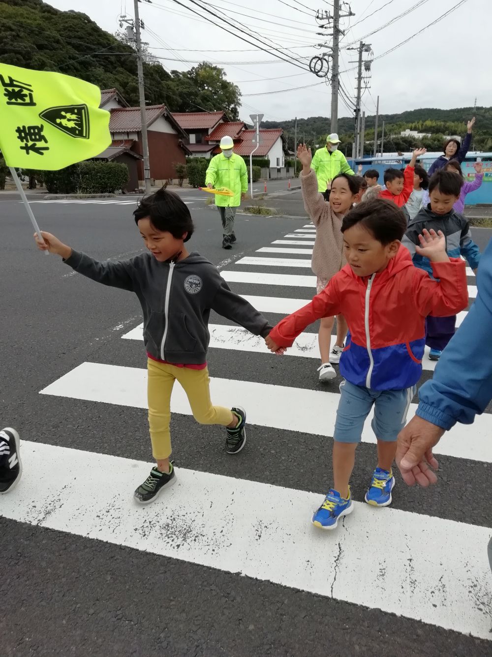 | 交通安全教室で、くじら組は実際に横断歩道を歩き安全に園外保育に出かけることができるように教えて頂きました。 |
