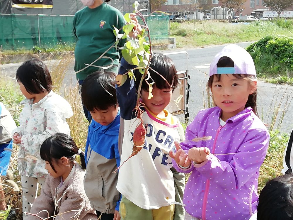 | 芋ほりをしました。土の中から芋が見えると夢中になって掘っていましたよ。掘った芋はそれぞれのクラスでクッキングをして食べる予定ですよ。 |