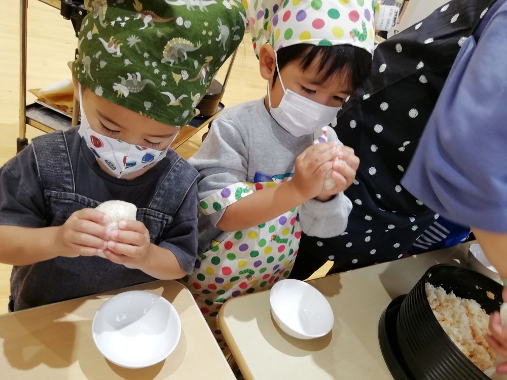 | 豚汁パーティーをしました。くじら組、しろくま組(4歳児)、あしか組(3歳児)がそれぞれ皮をむいたり、ちぎったり、包丁で切ったりして、みんなで作りました。あしか組はラップおにぎりを作ってくれましたよ。 |
