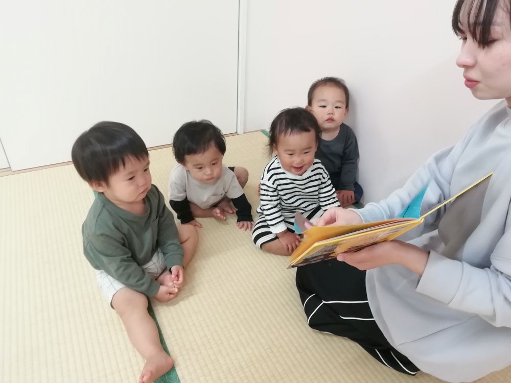 | ぺんぎん組(0歳児)の子どもたちも絵本が大好きです。保育者が絵本を読み始めると、集まってきて楽しく見ていますよ。 |
