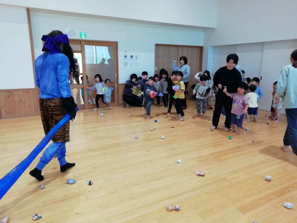 くじら組(5歳児)の子どもたちもがんばってくれ、みんなで力を合わせて、豆を投げてオニを退治しました!
