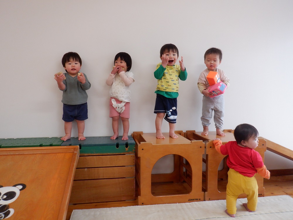 | キンキンきれいな冬のそらーと歌ってもらい「おーい」と答えているひよこ組の子どもたちです。元気いっぱいだね。 |