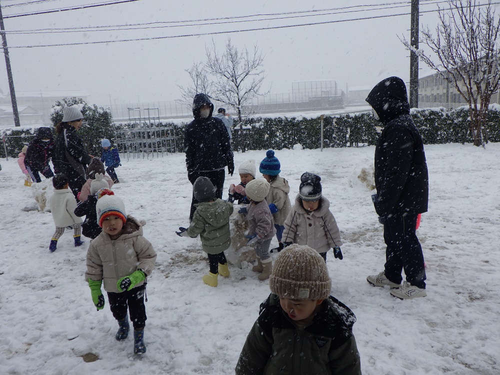 | こちらも雪玉を押してみたり雪を玉の上にのせてみたりしているうさぎ組の子どもたちです。 |