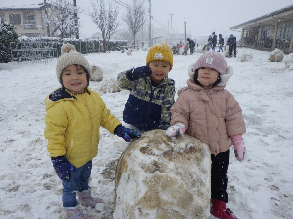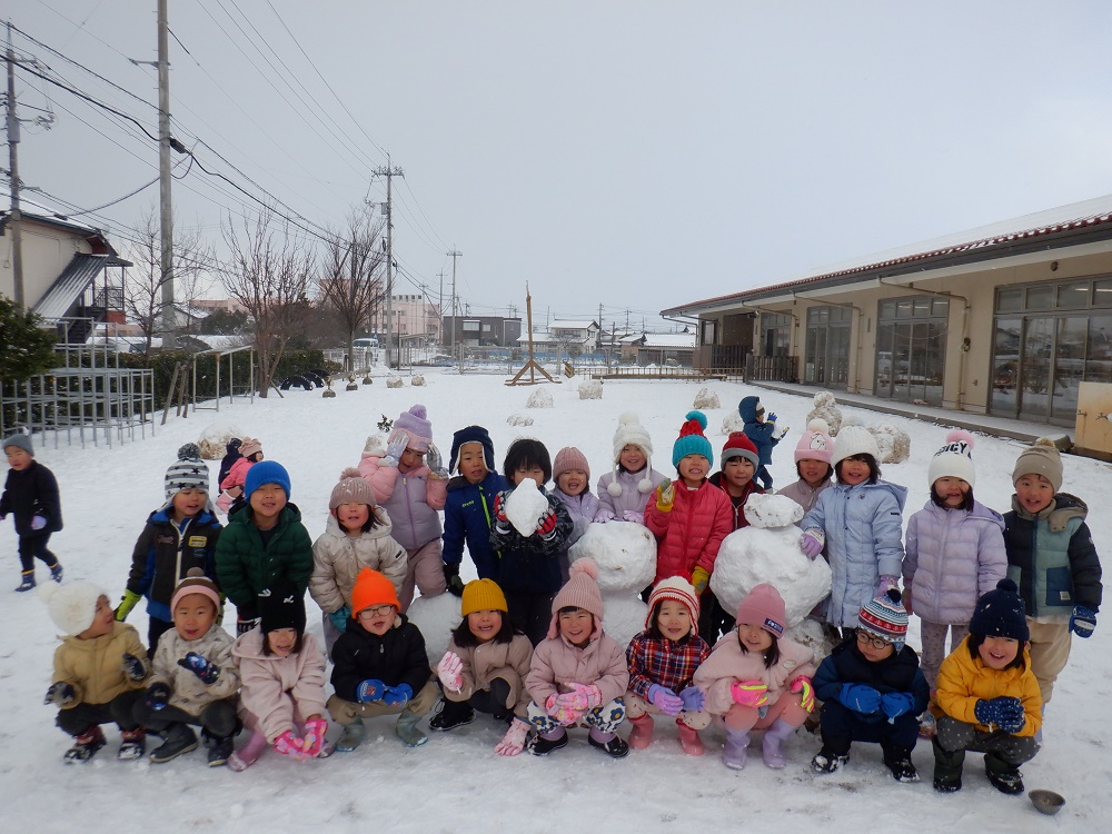| きりん組の子どもたちで作った雪だるまと一緒に。お友だちと一緒に作った雪だるまです。かわいいでしょ。 |