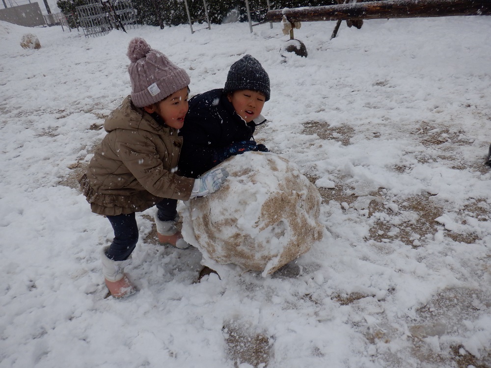 | ぱんだ組の子どもたちはお友だち一緒にころころと転がして雪玉を作っています。 |