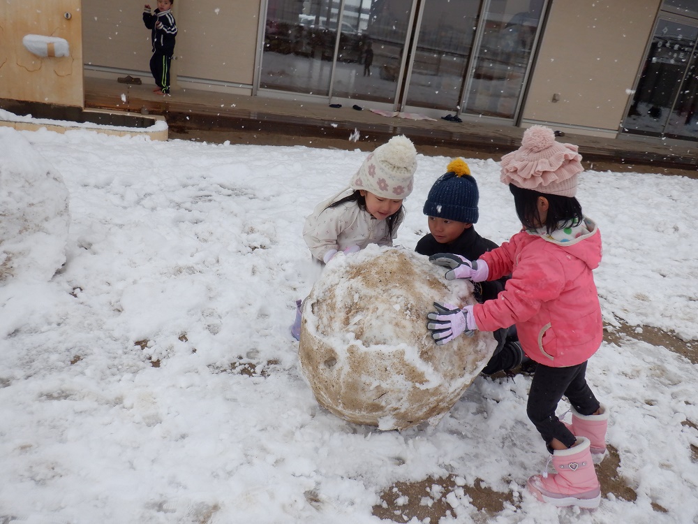 | 大きな雪玉を見つけて「大きいね」と言っていたうさぎ組の子どもたちです。大人と一緒にころころと転がしてみました。 |