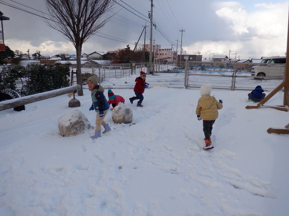 | 真っ白の雪の園庭を見て、「外で遊んでくる」と飛び出していったきりん組の子どもたちです。雪合戦をしたり築山から滑ったりして遊びました。 |
