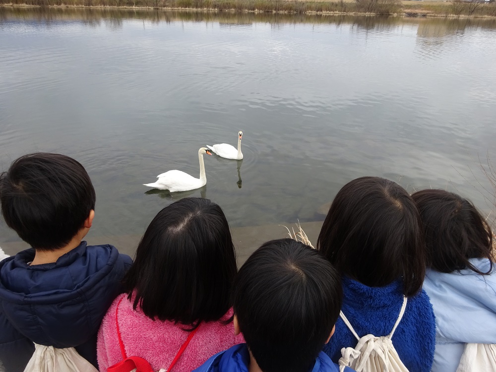 | 神戸川土手を上流に向かって歩いていくと白鳥に出会いました。「白鳥さーん」と呼びかけると近くまで来てくれたとらいおん組の子どもたちは大喜びでした。 |