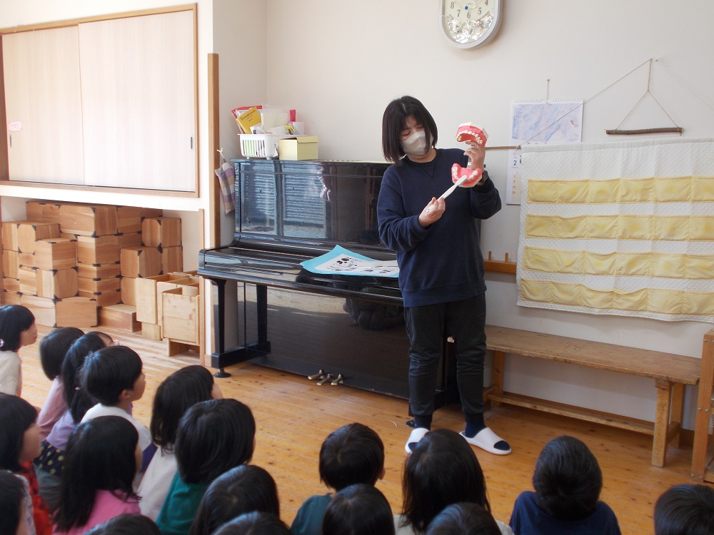 きりん組とらいおん組は「虫歯にならないために」のお話を聞いたり、歯の模型を使って歯の磨き方を教えてもらいましたよ。