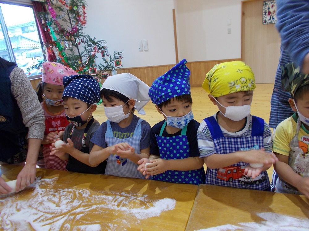 | もちつき会の様子です。こねこねと丸めるぱんだ組の子どもたちの手つきなかなかいいでしょ。 |