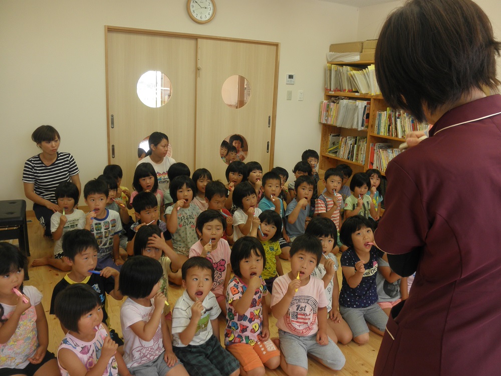お昼ご飯後、らいおん組ときりん組さんは歯科衛生士さんより歯磨き指導を受けました。虫歯にならないために・・・というお話をきいたりブラッシングの仕方を教えてもらいましたよ。