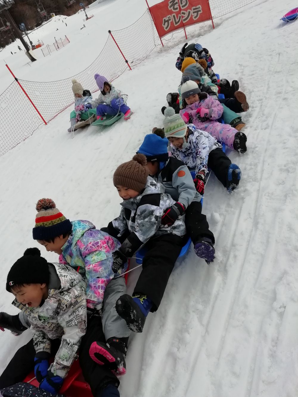 | くじら組としろくま組(4歳児)が琴引きフォレストパークへ行き、そり遊びをしました。友だちとつながって滑ったり、何度も滑って楽しみました。 |