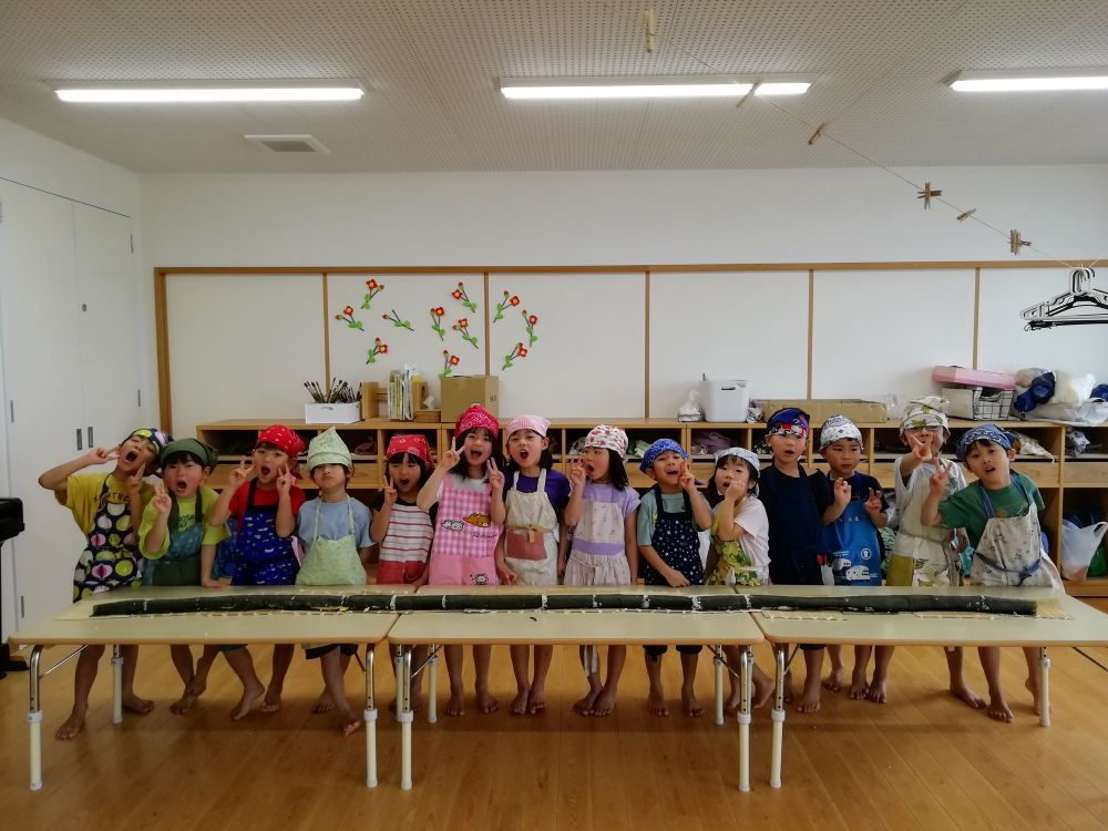 | くじら組が恵方巻作りをしました。全員で長い恵方巻にも挑戦しました。みんなで息を合わせて巻き、大成功でした! |