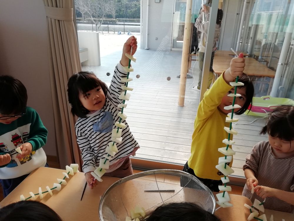 | くじら組としろくま組が切り干し大根作りをしました。しろくま組は公開給食の時に、お父さんやお母さんと一緒に食べましたよ。 |