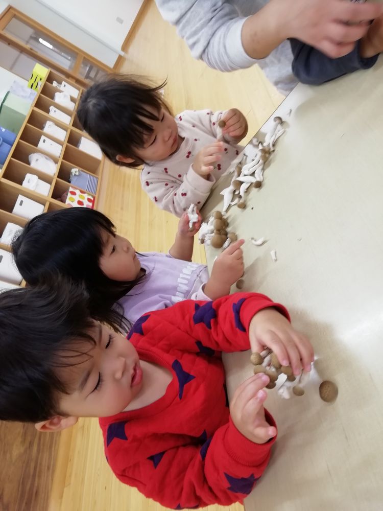| らっこ組が給食の下ごしらえのお手伝いをしました。しめじを上手にほぐしていました。給食でしめじを見つけるとうれしそうに食べていましたよ。 |