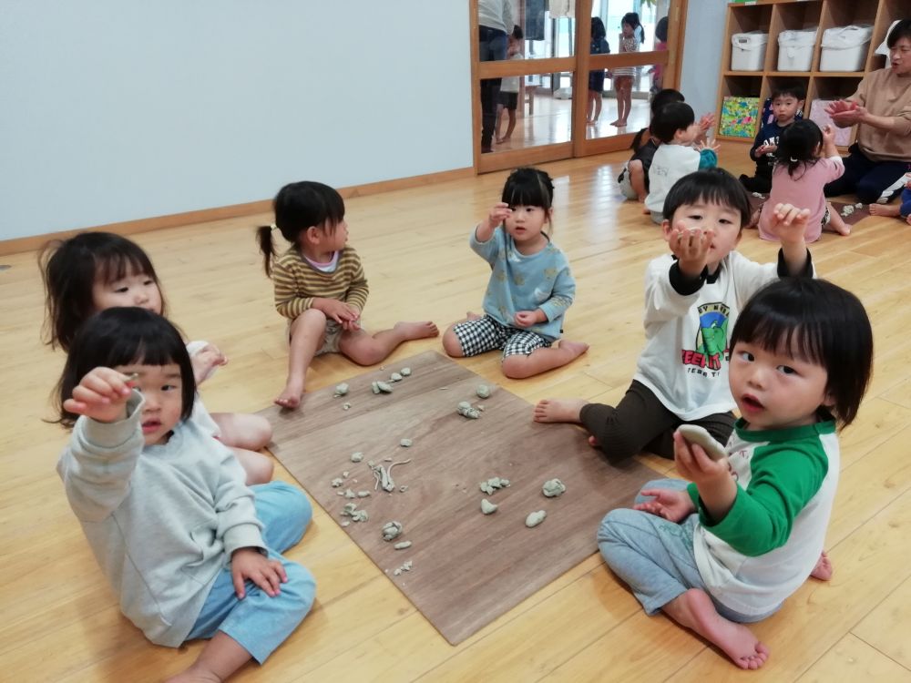 | いるか組(2歳児)が粘土遊びをしました。丸めたり細く伸ばしたり、思い思いに形を作り楽しみました。「みて!」とうれしそうに見せてくれましたよ。 |
