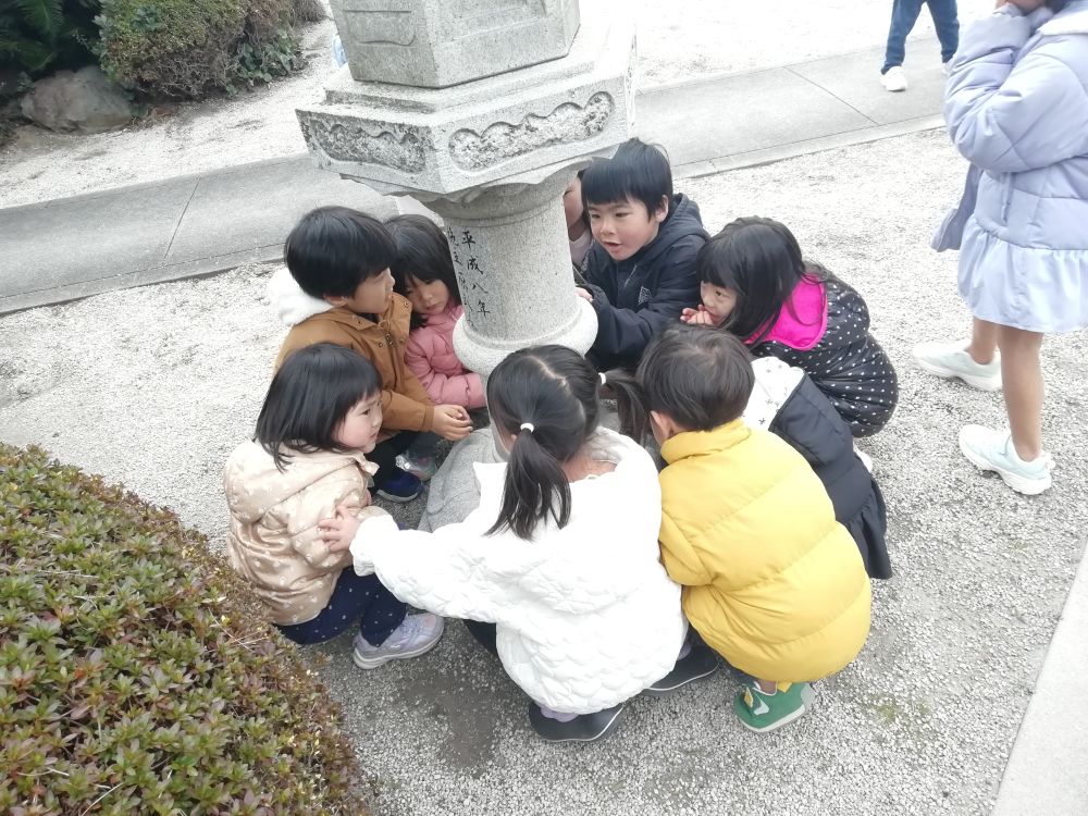 | しろくま組とあしか組(3歳児)が阿弥陀寺へ散歩に出かけました。みんなでかくれんぼをして遊びました。たくさんのオニさんで「もーいーかーい?」とうれしそうでした。 |