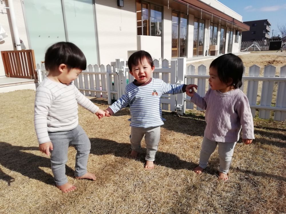| ぽかぽか陽気の日はお庭が気持ちよく、ぺんぎん組(0歳児)の子どもたちも戸外遊びを楽しんでいます。お友だちと手をつないでうれしそうです。 |