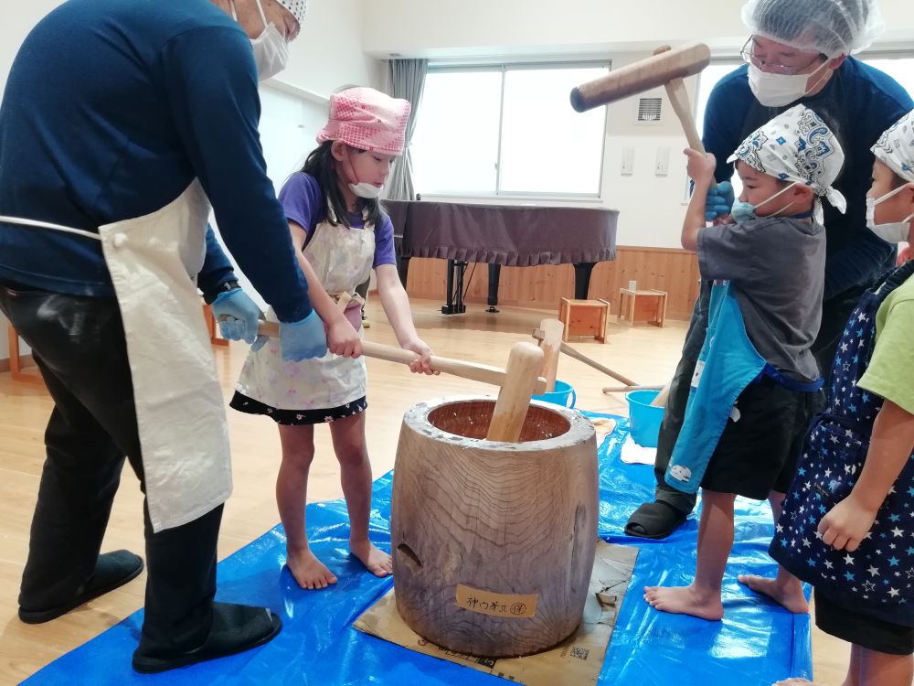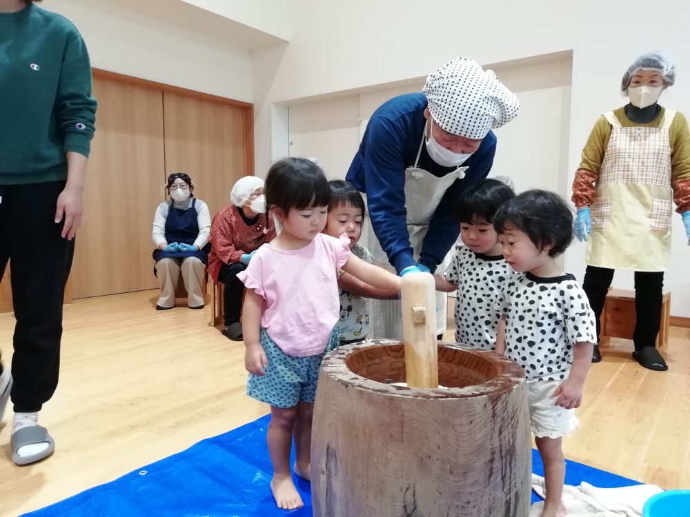 慶人会の方やお父さん、お母さん、おばあちゃんと一緒にもちつきをしました。「よいしょ!よいしょ!」と子どもたちの大きなかけ声とともにぺったんぺったんとおもちをつく音が響いていましたよ。