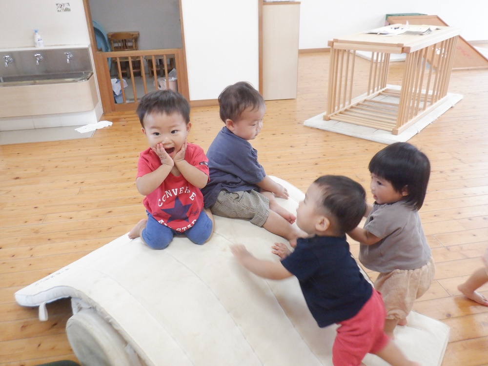ロールマット山に登ったりして遊ぶひよこ組の子どもたちです。上につくと「おーい」と呼びかける可愛い姿がありましたよ。 |