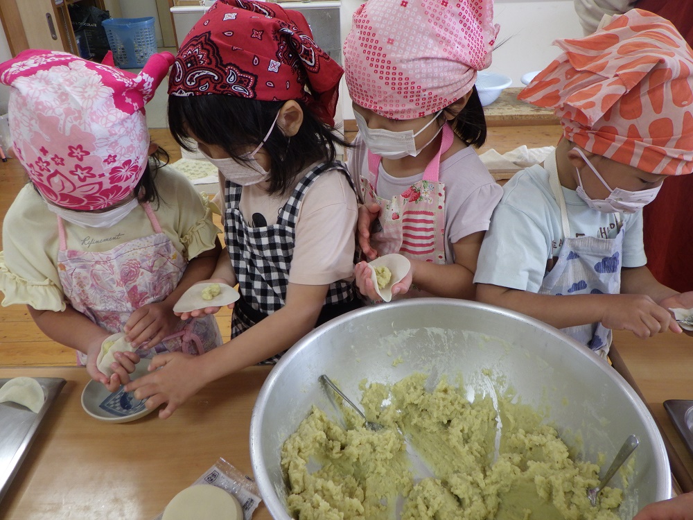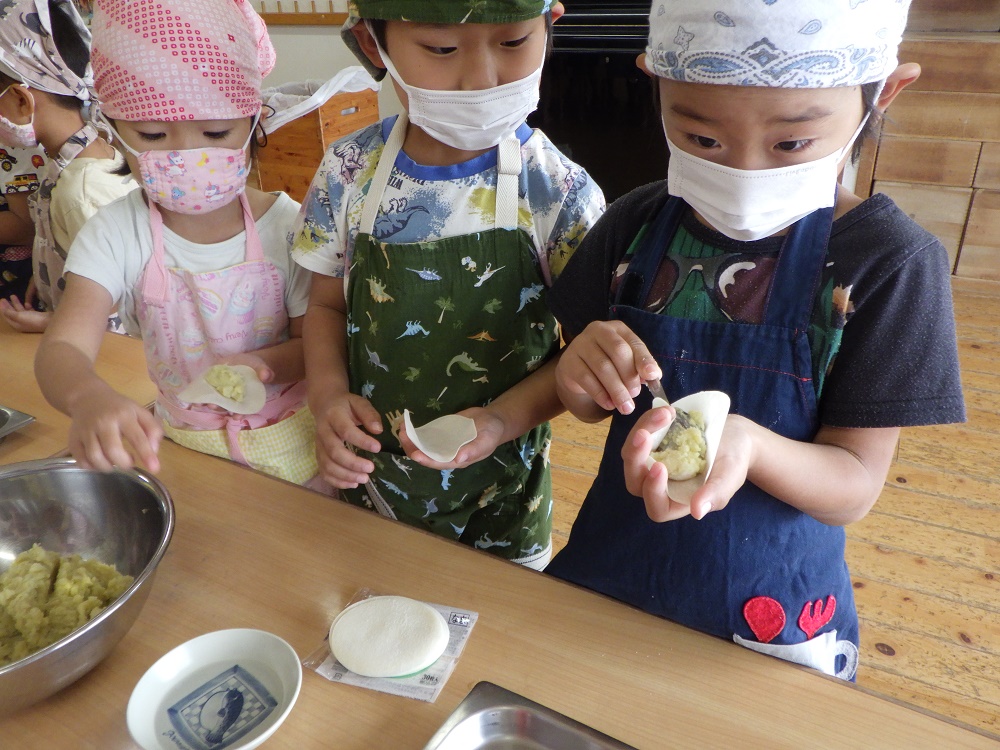 | サツマイモを使ってクッキングをしたきりん組です。芋を潰し味を調えて具ができたところで餃子の皮で包んでいきましたよ。