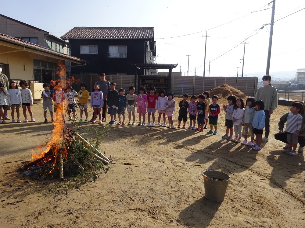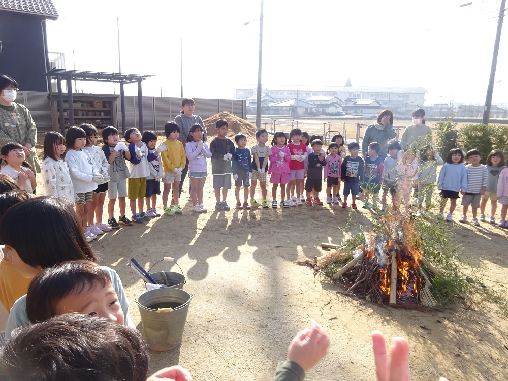 らいおんさんが切ってくれた竹やお正月飾りなどをたてて、とんどさんをしましたよ。これで一年元気に過ごせます。